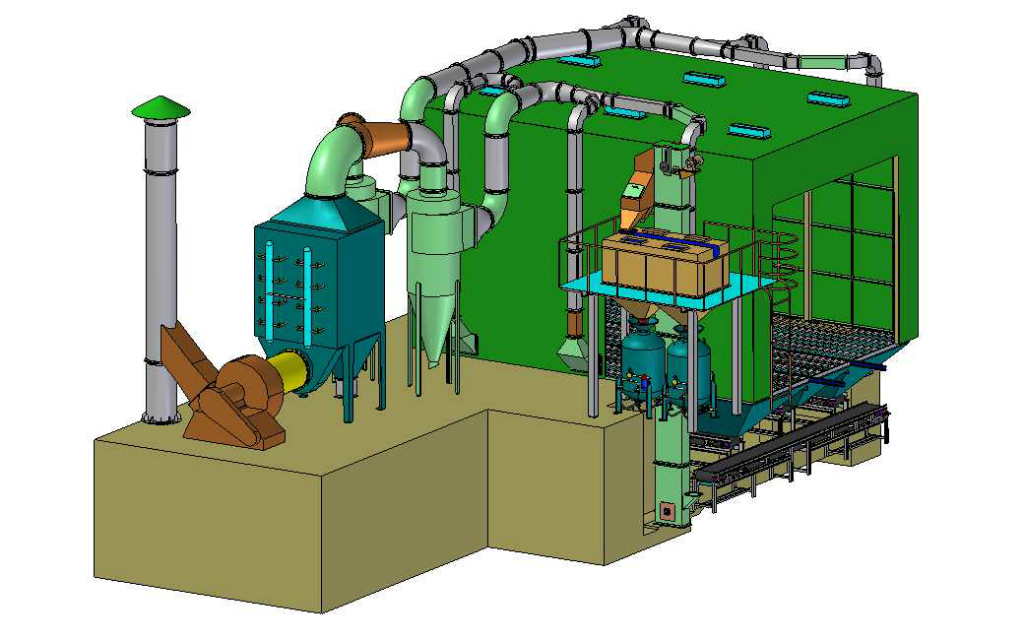 噴砂房的特點是采用蜂窩式吸砂地板技術,采用氣力輸送原理,利用空氣動力將砂料回收,再通過管道吸送到砂塵分選器中進行自動砂塵分選,分選出來的有用砂料自動落入噴砂壓力罐,進入循環使用;分選出來的破碎砂料、漆皮、氧化皮、粉塵等無用雜物則自動進入集塵器進行過濾除塵.